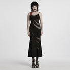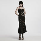 Embrace your bold side with this Women's Punk Mesh Splice Fishtailed Honeymoon Slip Dress. This daring slip dress combines punk rock aesthetics with an edgy, modern design. Featuring a sleek slim-fitted silhouette and high-quality elastic knit fabric, it offers both comfort and style. The unique mesh splice detail along the front creates a captivating contrast, adding a touch of gothic grunge flair.