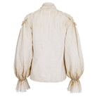 The stand collar of the shirt adds a touch of sophistication and Victorian flair, enhancing the overall aesthetic with its structured silhouette. Puff sleeves with flared cuffs create a dramatic and romantic look, adding a sense of whimsy and intrigue to your outfit.