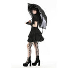 Adding to its allure, the umbrella boasts a lace hem design that borders the edge of the canopy. This lace trim enhances the umbrella's overall aesthetic, providing a soft, feminine touch that contrasts beautifully with the dark, gothic theme. The lace hem flutters gently with each movement, creating a whimsical and ethereal effect as you walk.