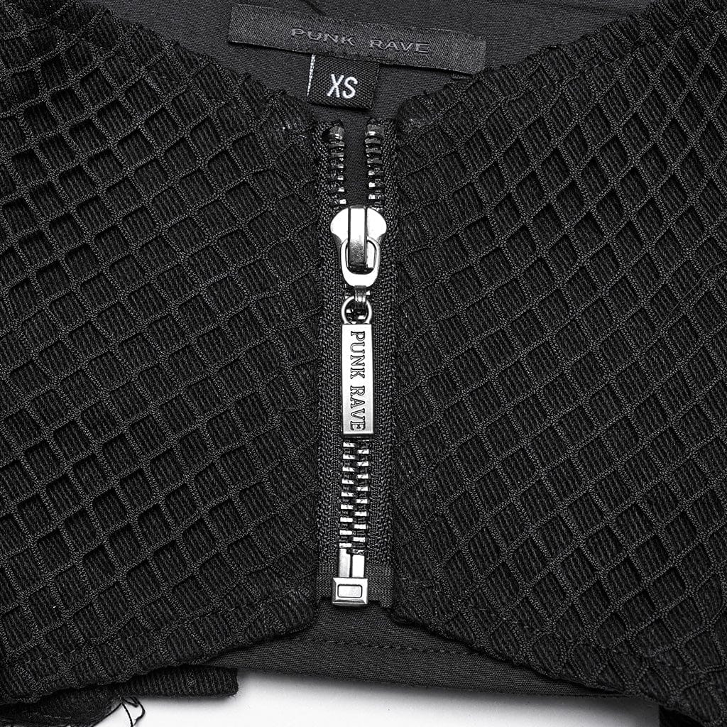 The interlaced lace-up design at the front is paired with metal eyelets, allowing for a customizable fit while adding a rebellious, gothic rock vibe. The corset features buckled straps on the sides, giving it an industrial gothic feel with its bold metal details. The back includes a zipper closure, providing ease of wear while maintaining the corset’s sleek and structured appearance.