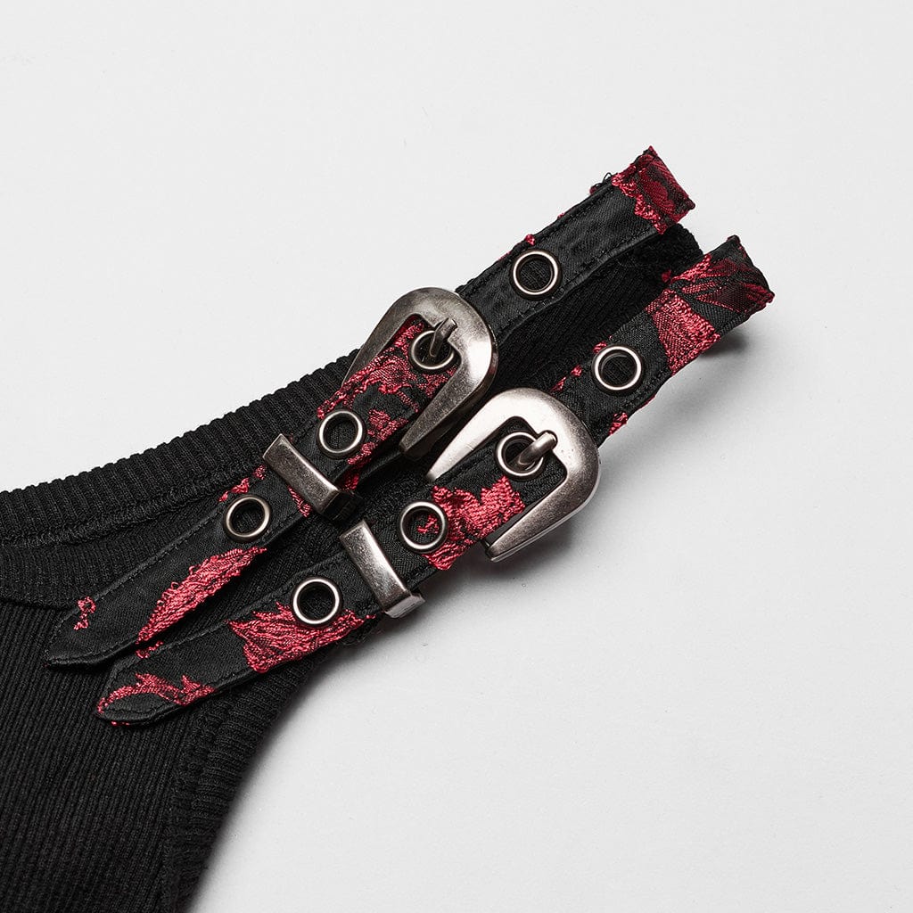 This gothic vest is made of jacquard and knitted fabric. Adjustable shoulder buckle straps. Decorative straps at both sides. Zipper on the front for put on and off. Lace-up on the back for adjustment. Slightly elastic fabric.