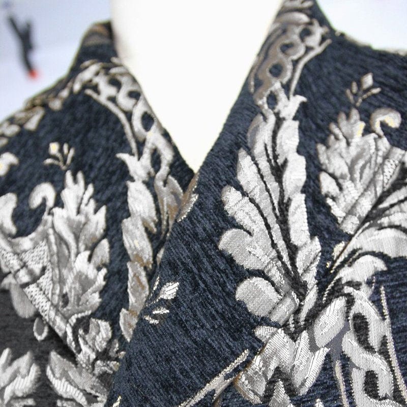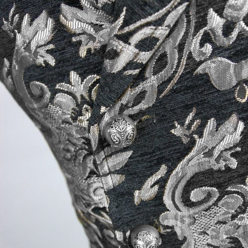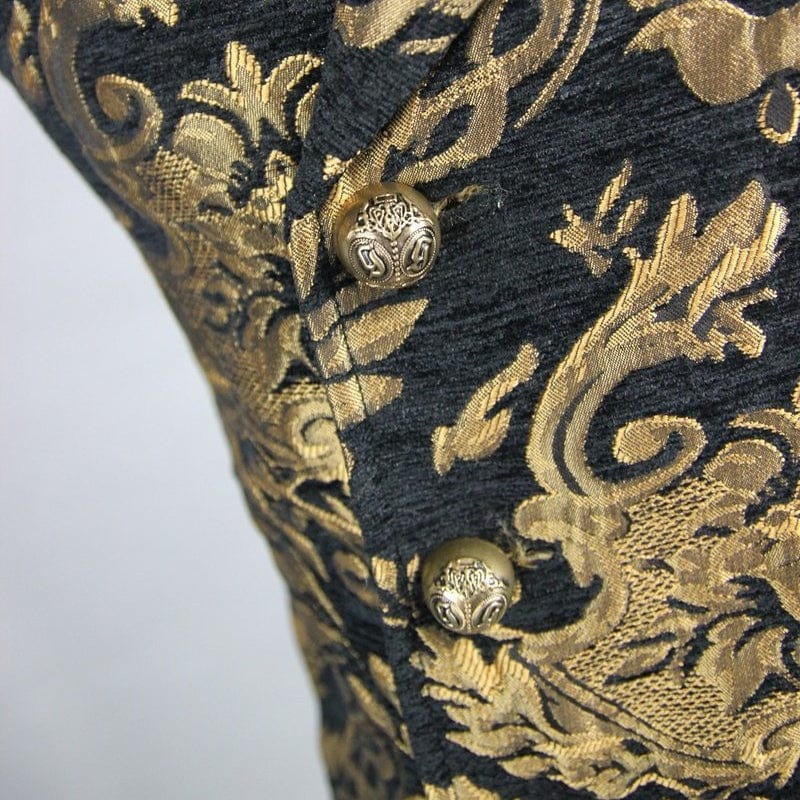 Description:Exquisite gold brocade fabric has been used to fashion this elegant waistcoat. The full brocade wasitcoat has a double breasted closure with beautiful filigree work buttons adding a rich and luxurious look to the vest. It has a notched collar and no sleeves.
