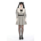 This vintage dress is a striped design. It has a doll collar and the collar hem is patchworked with lace. A bowknot is decorated on the neckline. A velvet strap adorns the waist and can be lace-up on the back. The fitted silhouette and no elastic fabric.