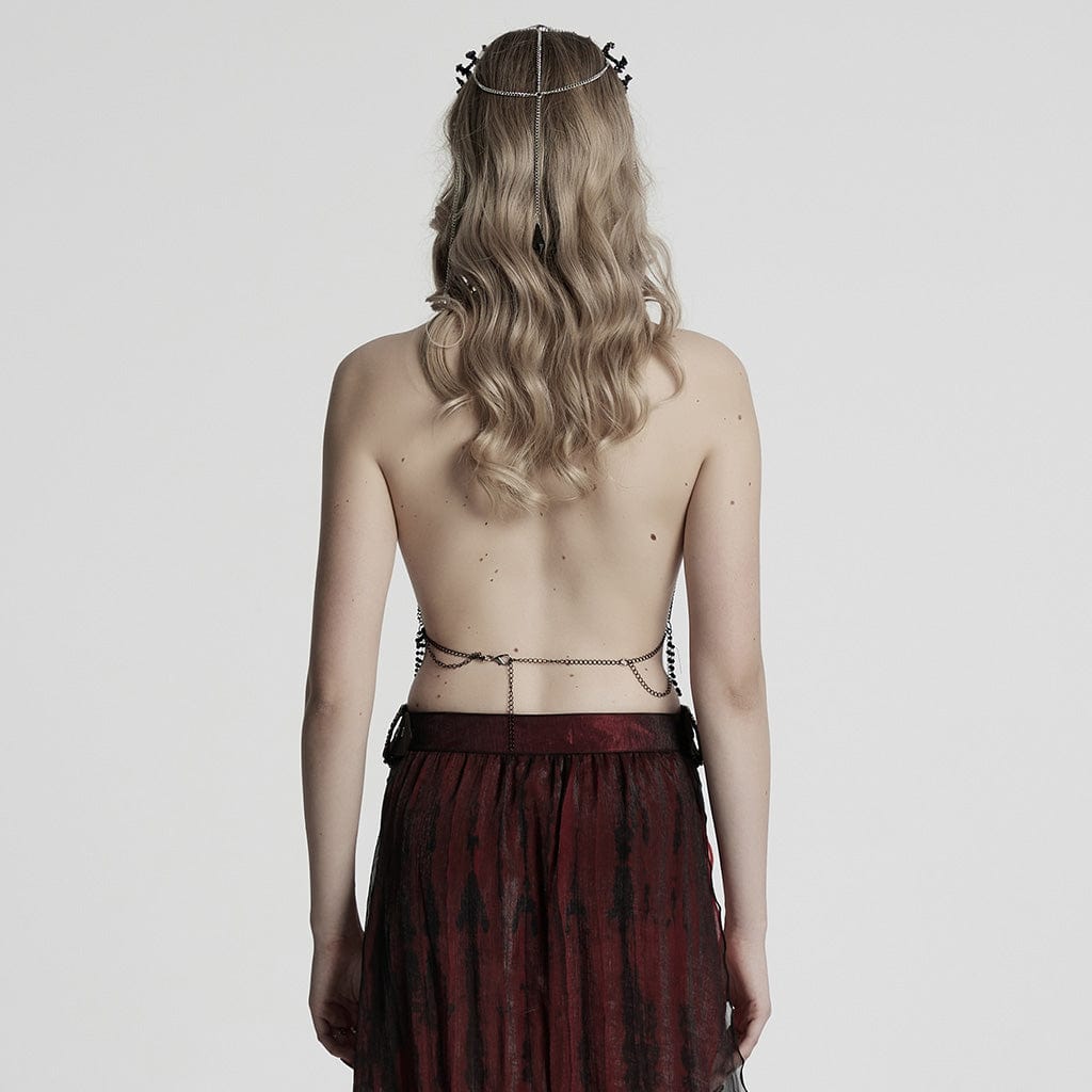 The halter design beautifully frames the shoulders and neckline, while the intricate chains and beads draw attention to the chest and waist, creating a bold yet delicate statement. The fitted silhouette ensures that this harness fits securely, enhancing your figure while keeping the dramatic gothic aesthetic intact. The no elastic fabric offers a firm, structured look while maintaining comfort.