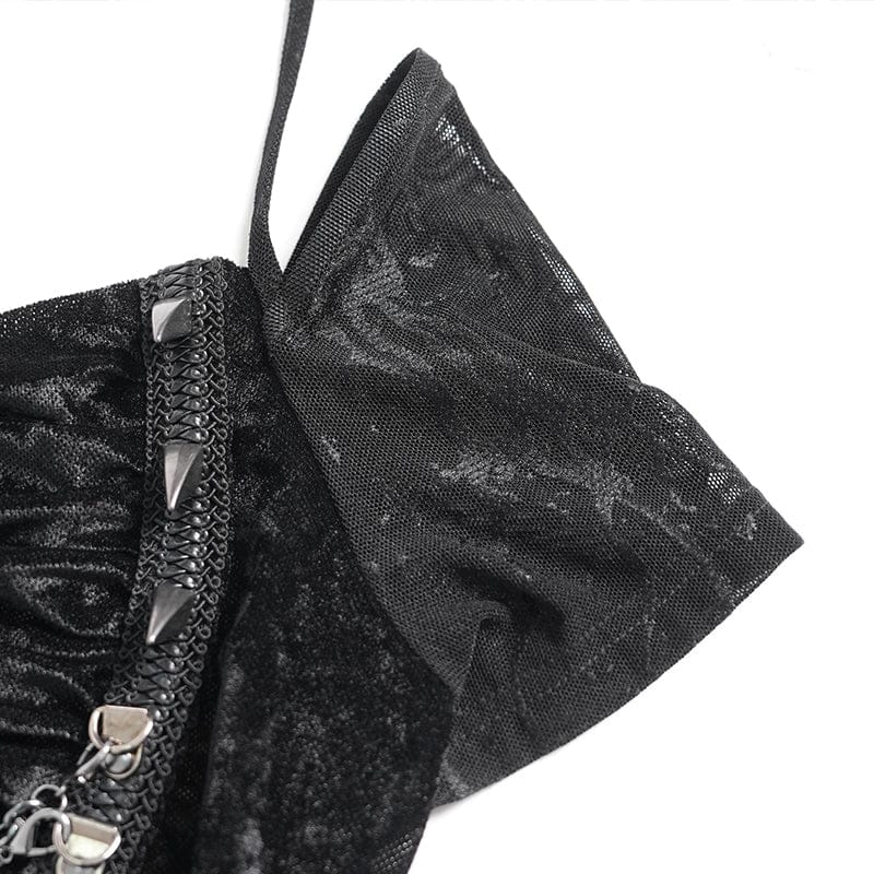 The Women's Punk Studded Chained Drawstring Short Sleeved Shirt is a bold statement piece for punk and alternative fashion rebels, blending raw punk rock energy with a punk goth edge. Crafted from a stretchy blend of polyamide, polyester, and elastane, it offers a slim fitted silhouette with a sheer, breathable mesh overlay.