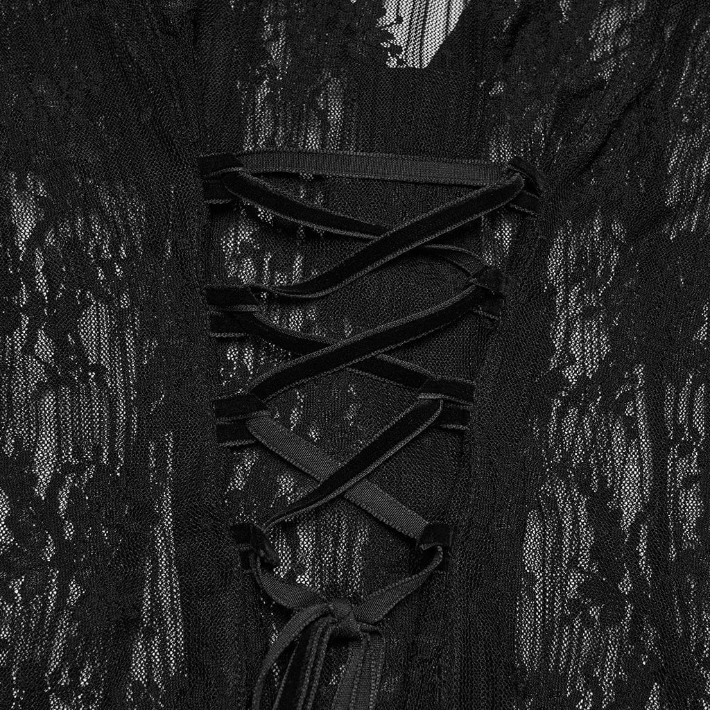 Women's Gothic Floral Cutout Lace Shirt is an essential piece for gothic and alternative wardrobes, balancing delicate lace texture with dark, romantic flair. The stand collar frames a plunging cutout neckline, while the flared lace sleeves add a victorian gothic touch to the slim fitted silhouette. At the back, a lace-up detail cinches the waist for a tailored, corset-inspired finish.