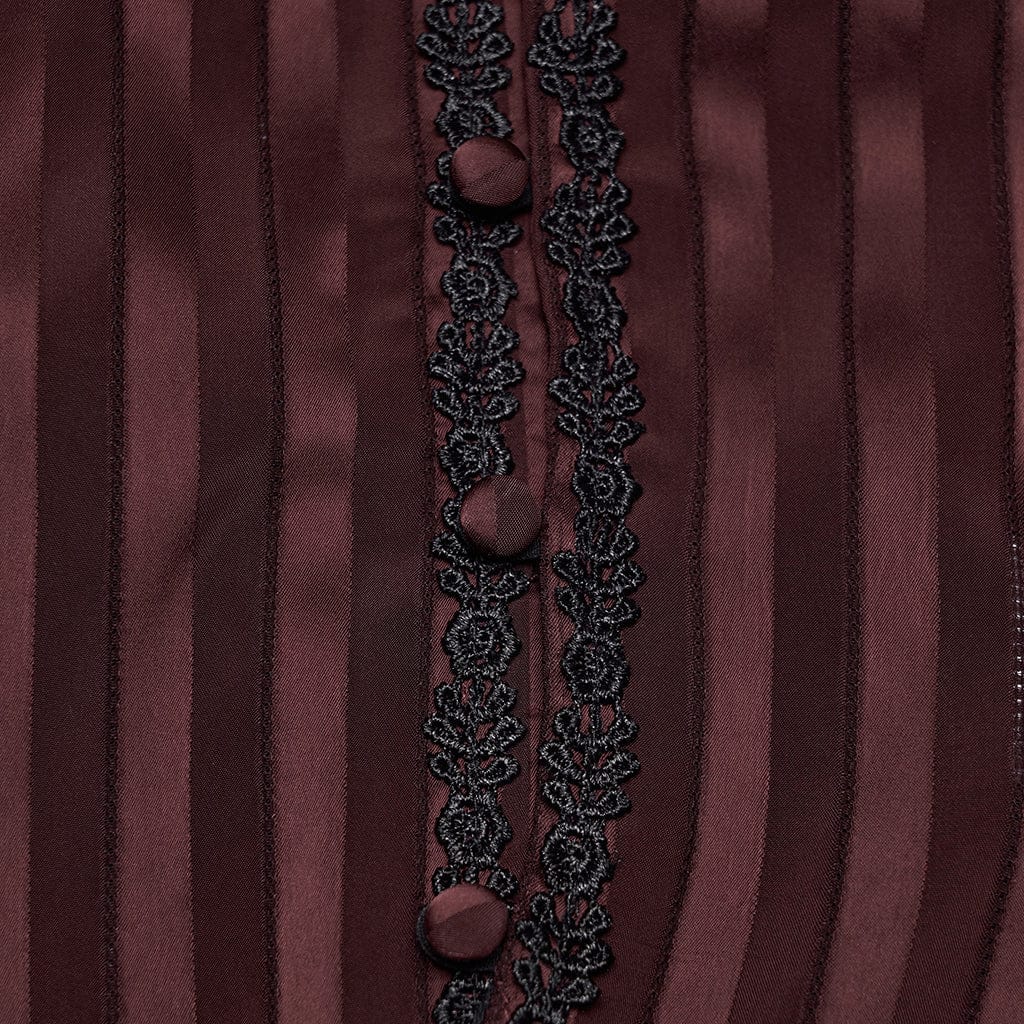 Women's Gothic Lace-up Striped Plunging Short Sleeved Shirt is a romantic yet edgy goth staple that blends victorian gothic refinement with retro flair. This slim fitted silhouette features a plunging neckline, puff short sleeves trimmed with delicate lace, and a front placket of glossy buttons framed by lace detailing, plus a back lace-up closure for a tailored fit.