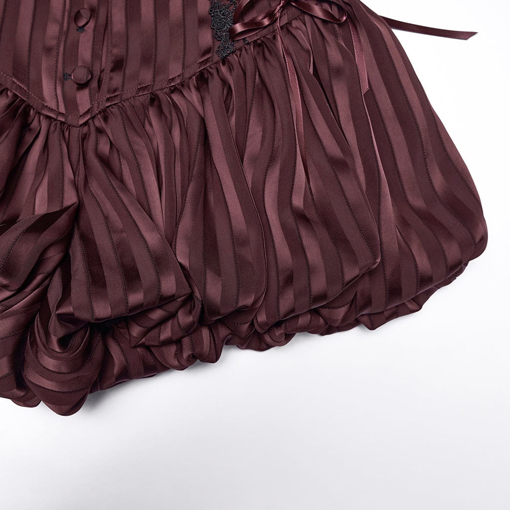 Women's Gothic Lace-up Striped Pumpkin Shorts are a playful yet edgy goth staple that blends victorian gothic romance with gothic lolita charm. This high-waisted silhouette features a striped satin texture, with side lace-up detailing trimmed in delicate black lace and a front placket of glossy buttons.
