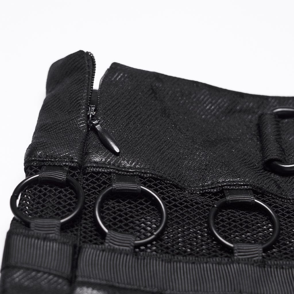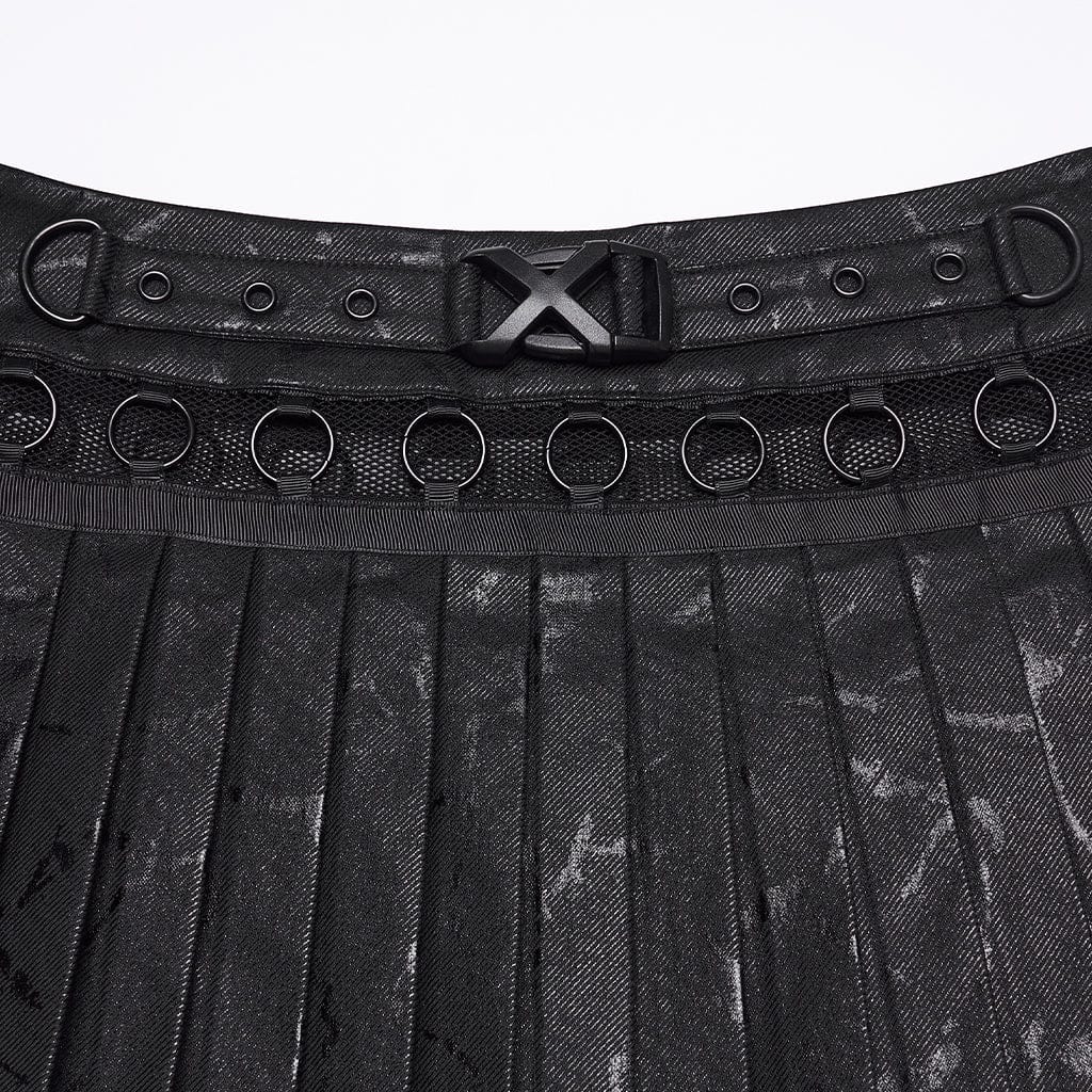 Women's Punk Printed Rings Pleated Skirt is a bold essential for every punk and alternative wardrobe, merging edgy punk goth attitude with everyday versatility. Crafted from premium cotton and elastane, it delivers a structured, crisp fit that holds its sharp silhouette perfectly. The low-rise waist features a statement X-shaped buckle, mesh panel with metal ring details, and crisp pleats, amplifying its rebellious punk rock vibe.