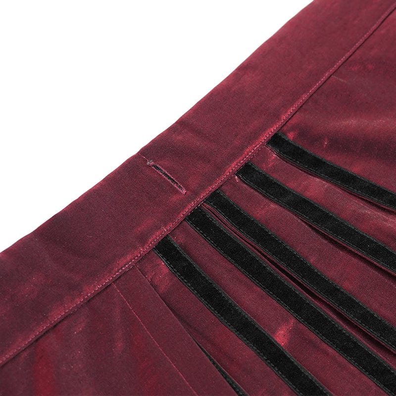 The sumptuous wine-red fabric serves as a dramatic canvas for intricate black Gothic embroidery—think shadowy lace motifs and archway-inspired patterns that whisper of medieval mystery. Pair with a corset-style black velvet top and pointed ankle boots, finishing with antique silver cross jewelry to unleash a regal, otherworldly aura fit for a Gothic soiree.