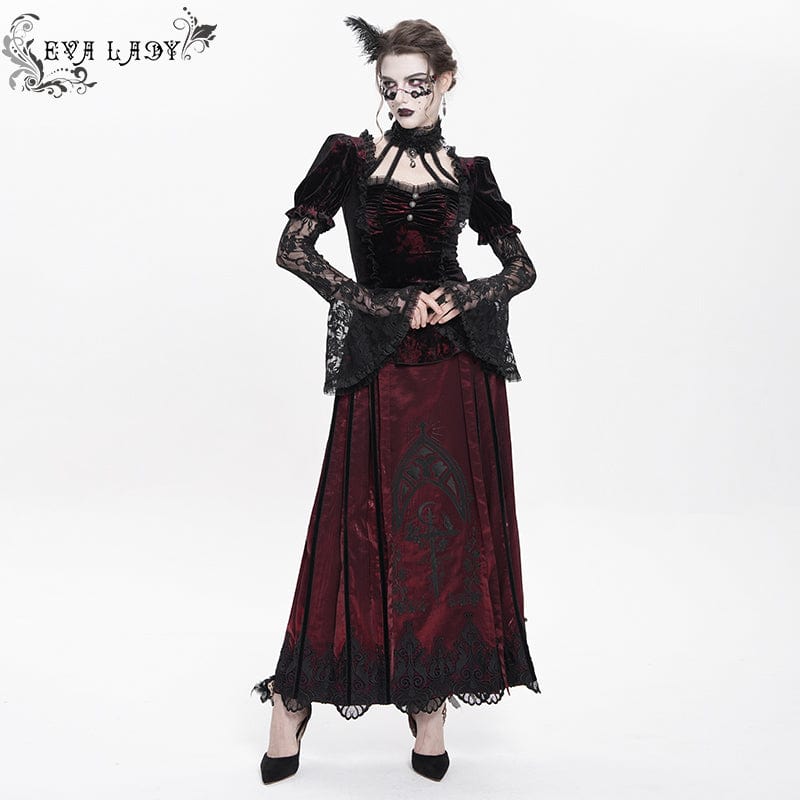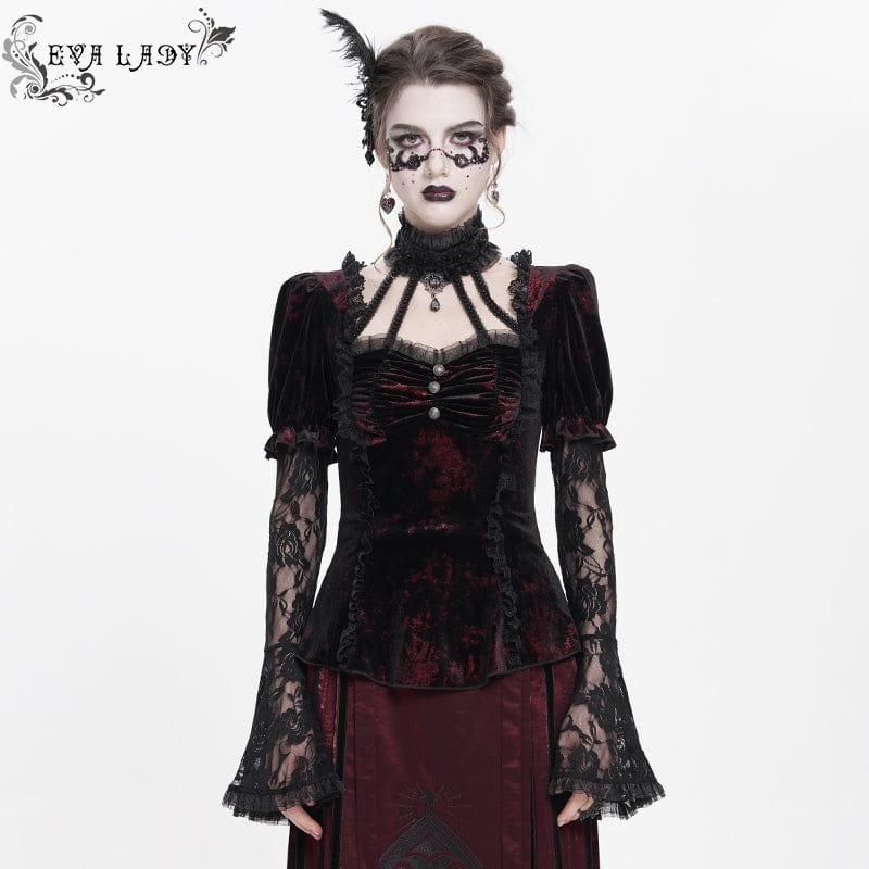 Women's Gothic Mesh Puff Long Sleeved Velvet Shirt Red