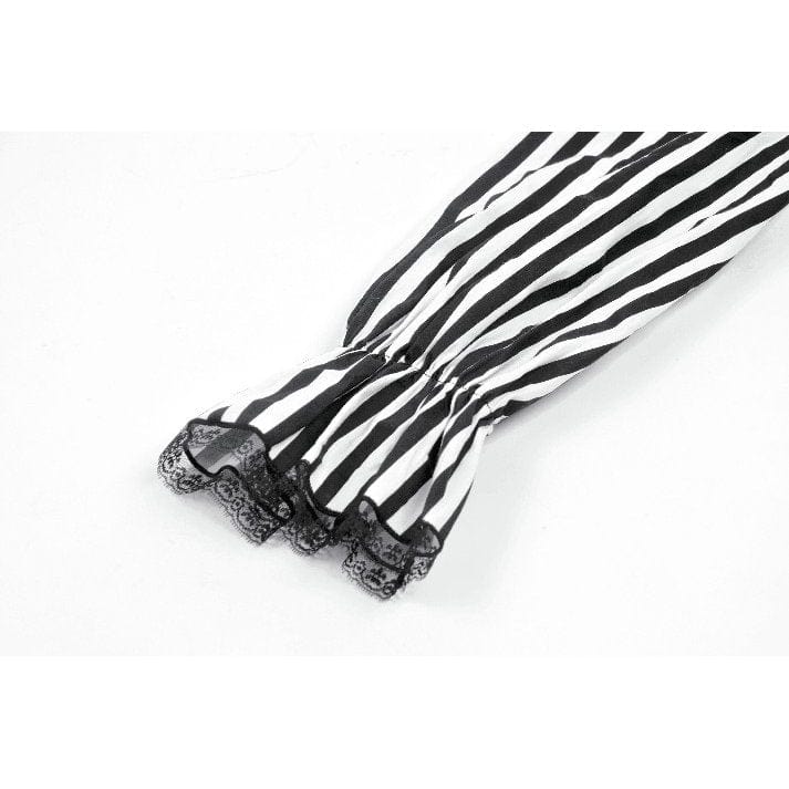 This dark-themed Lolita dress combines black-and-white stripes with black twill woven fabric, creating a layered look in a faux two-piece design. The neckline features a distinctive V-shaped cutout, wearable on its own or with the detachable neck bow for added versatility. The front placket has fully functional buttons for easy wear. The neck bow is crafted from black fabric, lace trim, a ribbon bow, and a moon pendant, adding intricate charm. Diagonal lace trim on both sides of the waist creates a slimming silhouette. The voluminous lantern sleeves are finished with lace-like trim at the cuffs. The hem is made from black fabric in a pleated design for enhanced depth and structure. A concealed side zipper adds convenience. Perfect for daily wear, parties, and ballroom events.