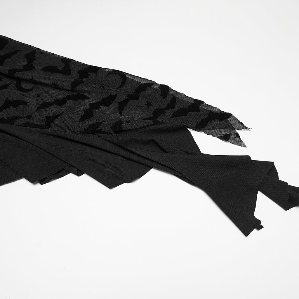 The exposed shoulders and perspective bat mesh sleeves create a cool, sexy vibe, while adding a mystical flair to the design. The ruffled front and irregular hem enhance your body shape, creating a flattering silhouette that exudes both elegance and agility. The unique combination of textures and asymmetry gives this dress an enchanting, otherworldly feel.