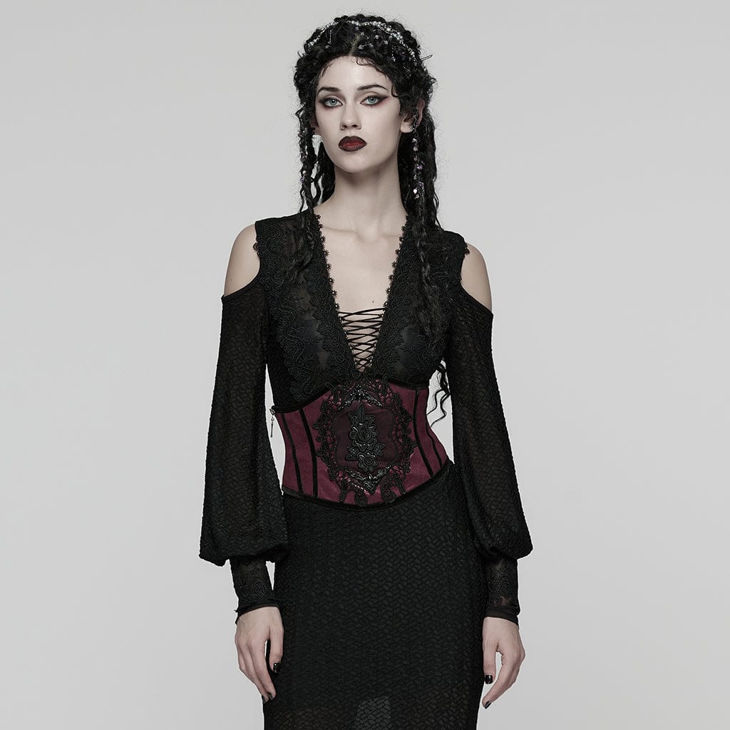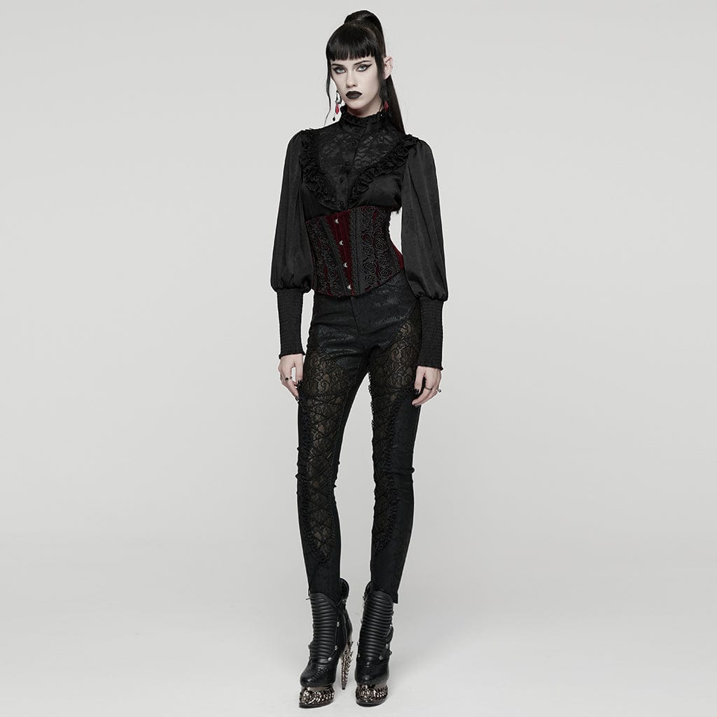 Many women who are into gothic outfits and lifestyles love to wear corsets(overbust corsets or underbust corsets). The common color for this garment is black, although sometimes the corsets can come in other colors such as red. The corsets are made of a wide range of materials. Often, gothic corsets will have multiple materials on them. For example, one garment may include synthetic leather and lace. A corset is a versatile garment because it pairs well with many other types of gothic clothing, including pants, skirts, and leggings.