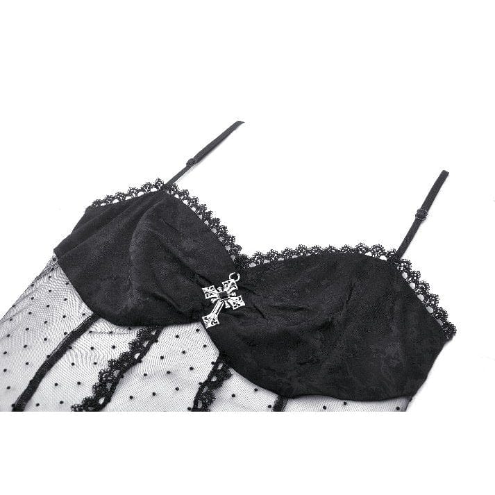 The centerpiece of this top features intricate patchwork with polka-dotted lace, adding a playful yet gothic touch to the overall design. The lace hem on the neckline enhances its Victorian Gothic appeal, providing a refined and elegant finish. A striking metal cross adorns the front, serving as a focal point that captures the eye and reinforces the gothic theme.
