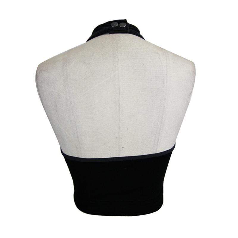 Description:Short top has all the punk markings to it. The halter neck has a deep beck that is held together with criss cross patterned straps and a band collar that fits close to the neck. The waist length top has a filigree crescent moon dangling from the throat.