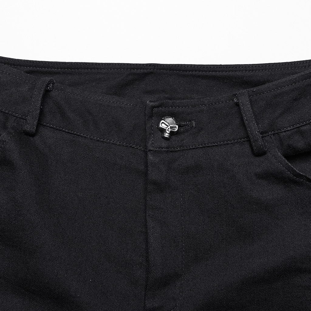 The base of the pants is constructed from elastic twill denim, known for its durability and slight stretch. This fabric provides a snug, slim-fit silhouette that contours to the body while allowing for comfortable movement. The denim's texture adds a touch of ruggedness, perfect for creating a bold fashion statement.