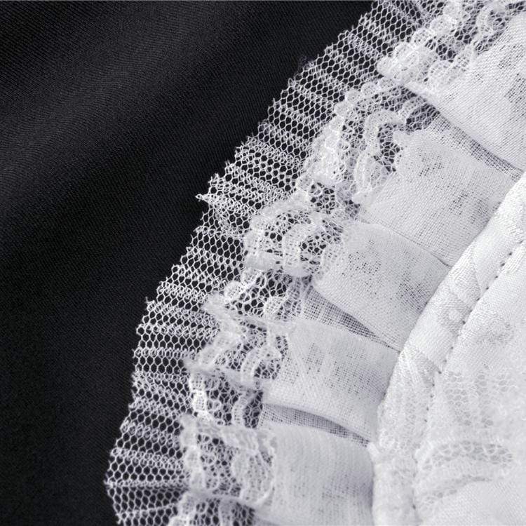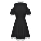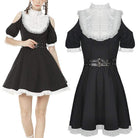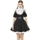 Another in the series of maid-inspired Gothic dresses comes with cutout shoulders, wide round white front, and belt in a motorbike-style. It has a wide A-line cut.