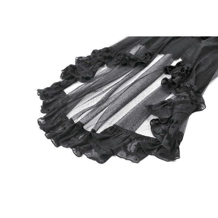 Delicately flared bell sleeves attach from mini shoulders, ending in rippled cuffs that flow gracefully. The double-layered front hem blends velvet mesh and sheer fabrics for a romantic Gothic touch, while the back features a fluid combination of mesh and velvet panels to simulate a starry night sky in motion.