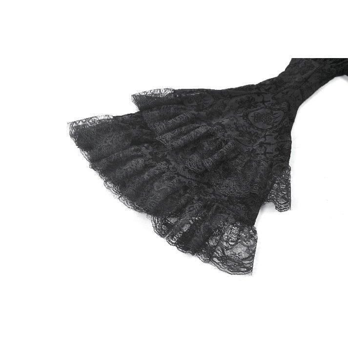 The sleeves are architectural in design — a voluminous arc-shaped puff shoulder blends into layered sleeves trimmed with intricate lace, creating a sculptural, dramatic silhouette worthy of a dark queen.