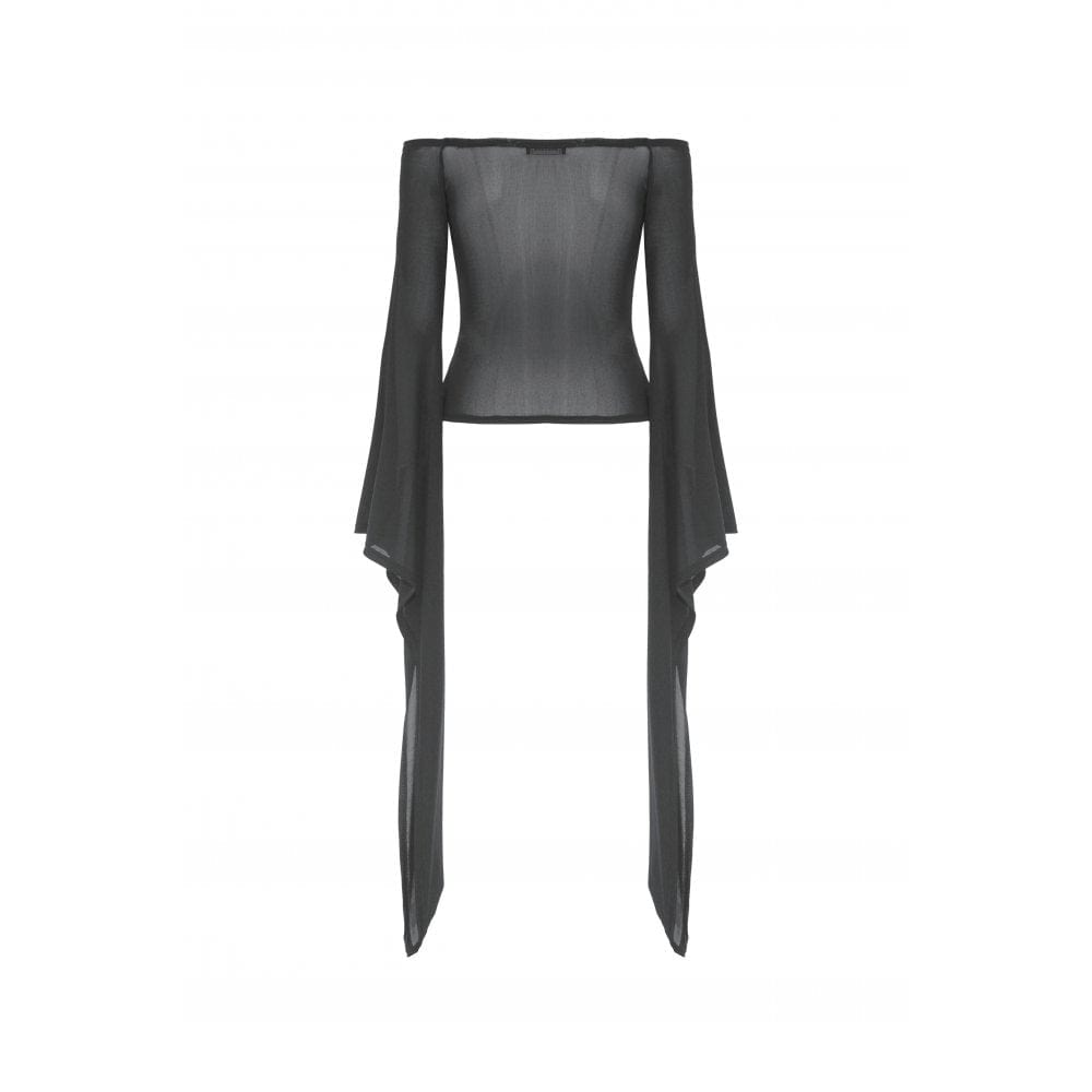 This gothic blouse is made of mesh. Detailed design with off-shoulder, lace-up on the front, and big flared sleeves. Slim-fit silhouette and super elastic fabric.